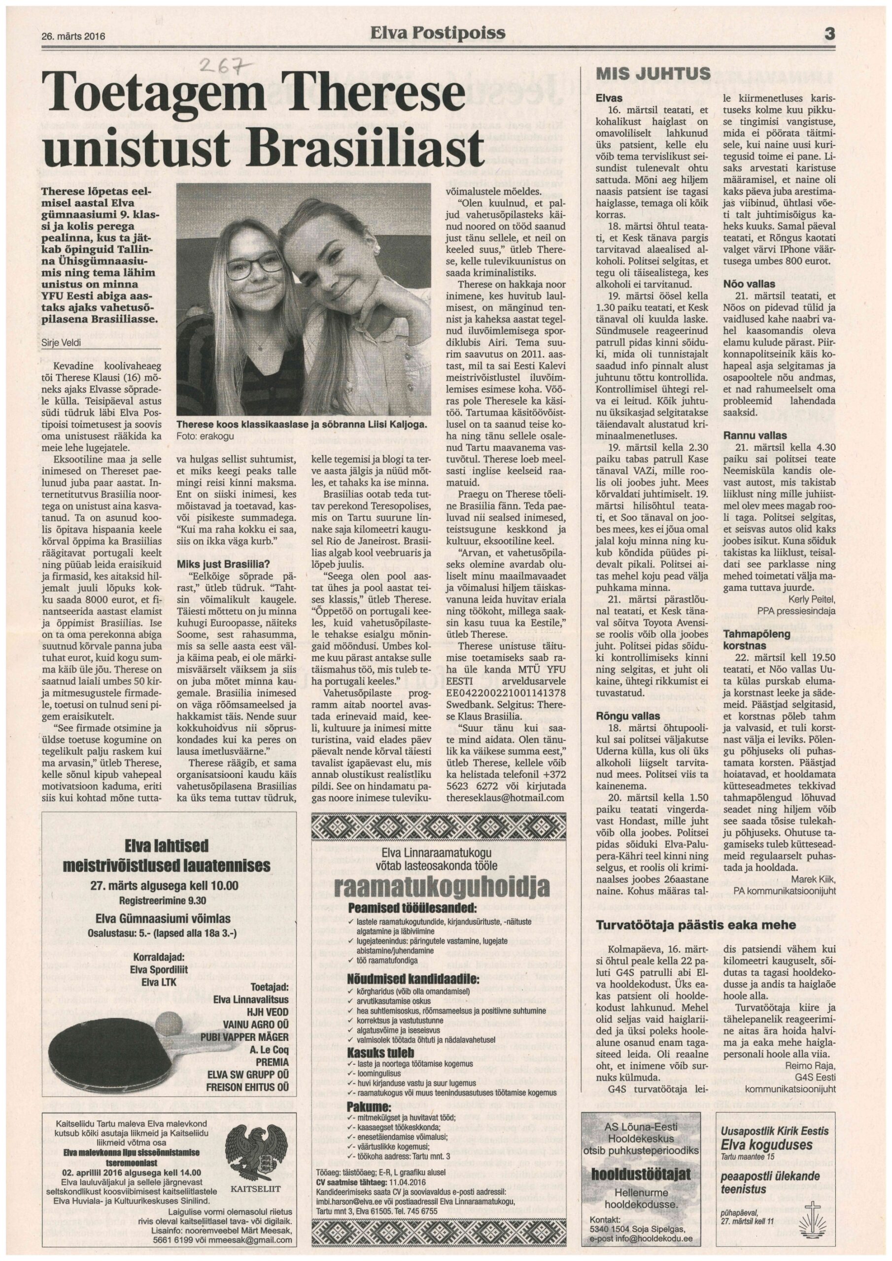 Meie kooli 9. klassi lõpetanud Therese Klaus plaanib õpinguid jätkata vahetusõpilasena Brasiilias.